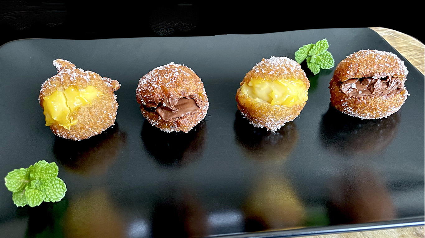 Cuando los veamos bien dorados, los sacamos y los ponemos a enfriar en una bandeja donde habremos puesto papel de cocina, cuando estén fríos los pasamos por azúcar. Los podemos rellenar con crema pastelera.