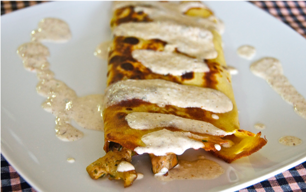 Hacemos la crêpe, la rellenamos con las setas y decoramos por encima con la crema que hemos preparado.