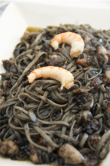 Picaremos la cebolla y los ajos con el cuchillo y los reservaremos. En una sartén grande pondremos aceite de oliva a calentar, pondremos las gambas y las salpimentaremos, cuando estén hechas las reservaremos y pelaremos. En la misma sartén pondremos la cebolla y los ajos picados cuando empiecen a dorarse añadiremos el calamar y dejaremos que se sofría la cebolla despacio y sin dejar de remover hasta que quede con la textura de una mermelada. Añadiremos la ñora, pimienta roja dulce, las gambas cortadas a tacos, menos cuatro que usaremos para adornar, los espaguetis y la tinta de calamar. Lo mezclaremos todo muy bien, lo dejaremos un par de minutos y a servir.