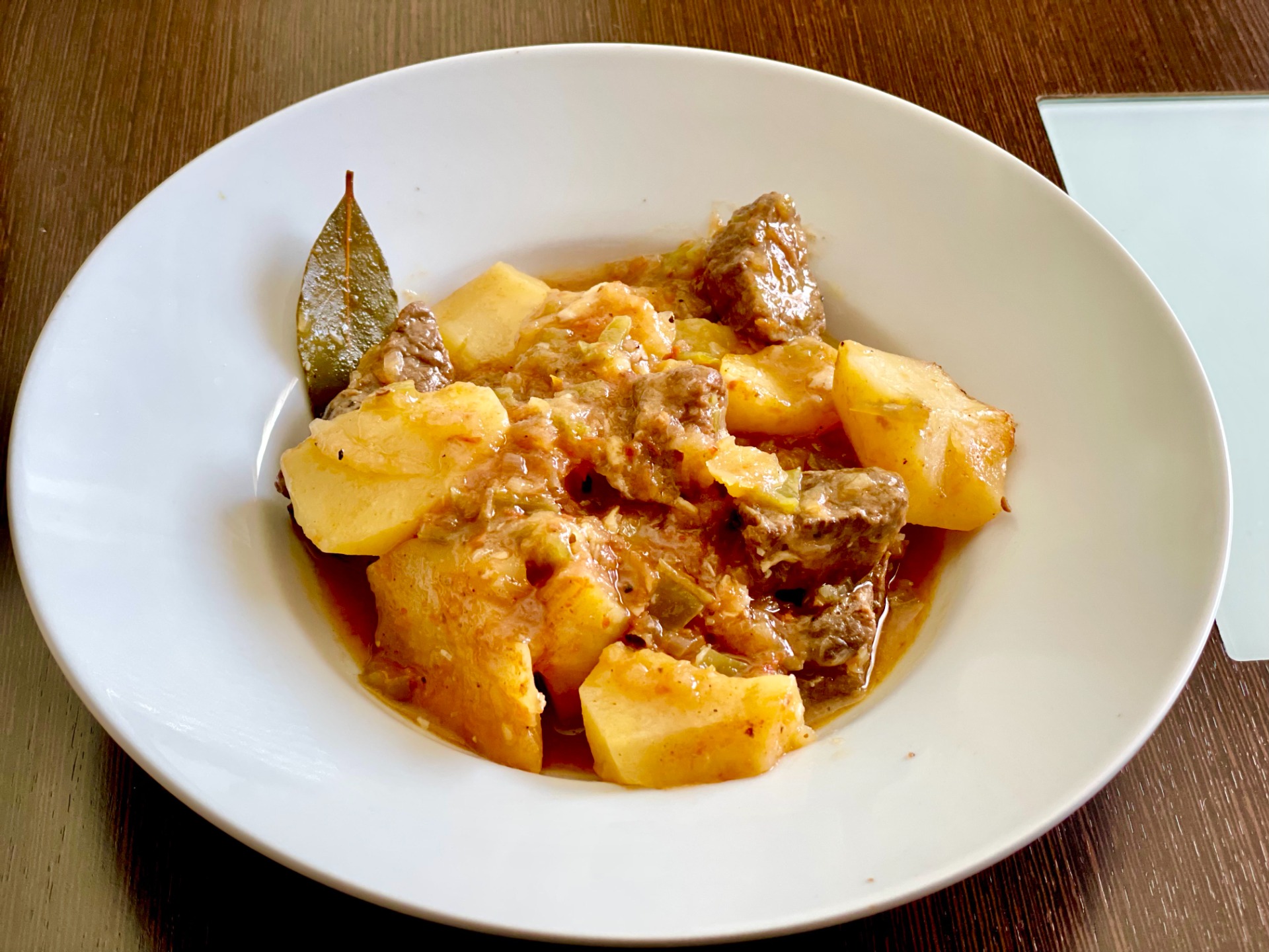 Pondremos la cebolla, zanahoria y pimiento verde a pochar unos 15 minutos, añadiremos el tomate frito. Lo dejaremos un par de minutos y añadiremos la ternera. Pondremos el vino blanco, el vermut, la hoja de laurel y el pimentón dulce, dejamos reduzca un poco y cubriremos de agua hasta que sobrepase un par de dedos la ternera y taparemos. Dejaremos una hora y cuarto aproximadamente, si hace falta añadiremos agua.