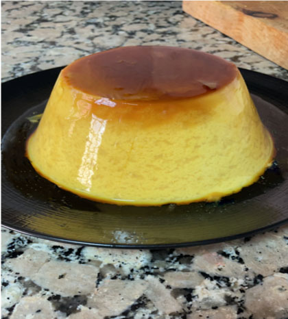 Ponemos el caramelo liquido en el fondo de una flanera grande con tapa y añadimos la mezcla que hemos hecho. Dejamos que se enfríe y ponemos en el frigorífico.