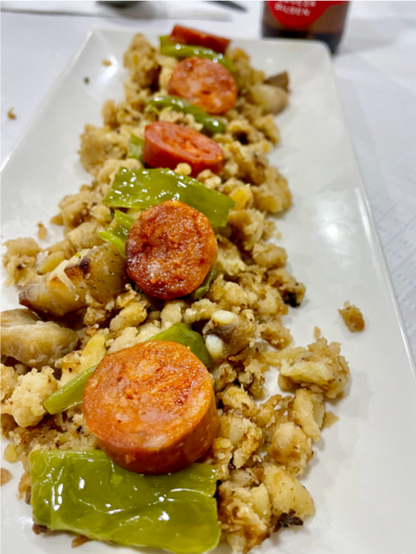 Pondremos el aceite en una sartén grande, freiremos la morcilla, el chorizo, el lomo, el pimiento y lo reservaremos. Ponemos el agua a punto de ebullición y añadimos la harina. Con la ayuda de una espatula la vamos mezclando
