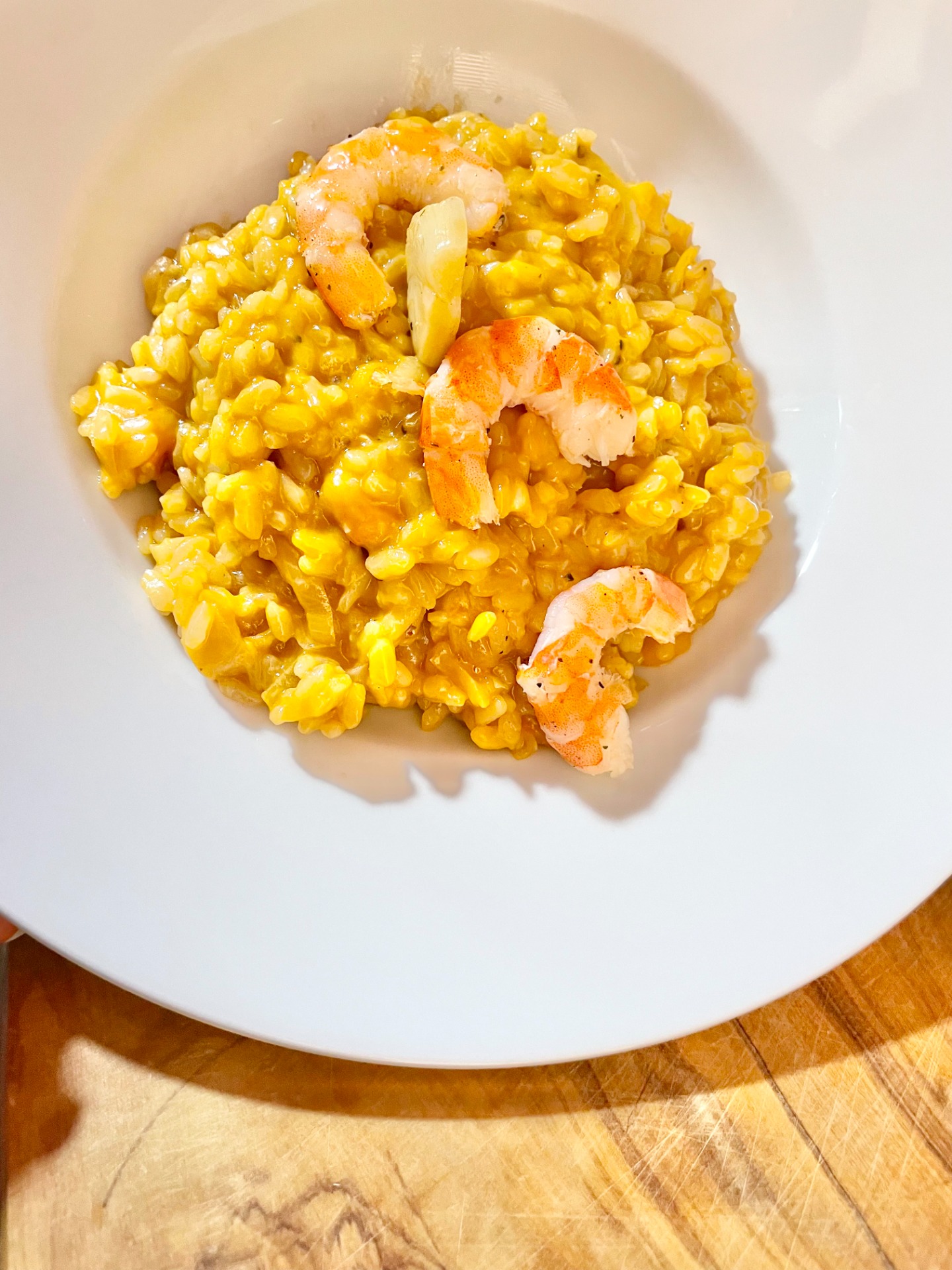 Mientras, pondremos el caldo de pescado a calentar hasta que empiece a hervir. A la sartén añadiremos el arroz que doraremos y una vez lo tenemos dorado pondremos el vino blanco y cuando evapore el alcohol lo cubrimos con una tercera parte del caldo de pescado. Subiremos el fuego hasta que empiece a hervir muy suavemente. Manteniendo el hervor iremos añadiendo el resto del caldo de pescado para que lo vaya absorbiendo el arroz. Cuando el arroz ya este casi hecho aproximadamente 20 minutos, añadimos las gambas, la mantequilla y el queso apagamos el fuego y mezclamos hasta que se derrita. Ya podemos servir.