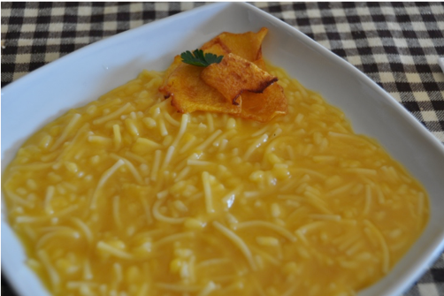 Sacamos la carne y la reservamos con un poco del caldo. Colamos el caldo, reservamos las verduras también y ponemos dentro la calabaza cortada a trozos, añadimos medio litro de agua y lo dejamos que hierva media hora mas.
