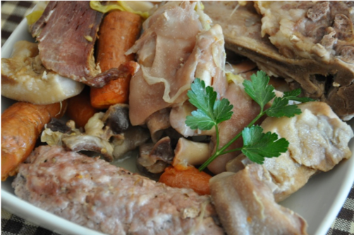 Pondremos 5 litros de agua en una olla y pondremos dentro la gallina, los huesos, el morro, la oreja, la cola, la col, la patata, el puerro, el apio y la chirivía.